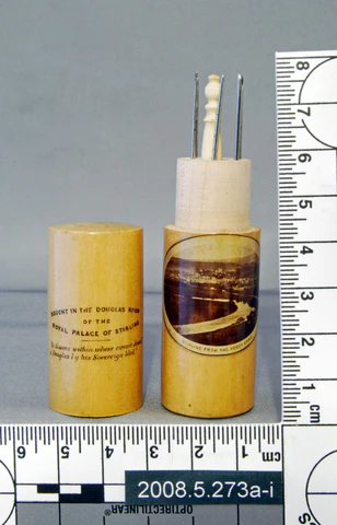 Several items from our sewing collection feature Mauchline ware. First, the heart-shaped pincushion [Fig. 1] showcases a transfer ware of St. Peter’s Church in Bournemouth on one side as well as a view of Exeter road on the opposite side. The second example is a tatting shuttle [Fig. 2], which illustrates the use of tartan, in this case the tartan of the Clan MacLean. Tatting shuttles were common and practical in Victorian times as they were used to create delicate lace work that would ornate edgings. The last item is a case containing a needlework kit [Fig. 3] that was ‘Bought in the Douglas Room of the Royal Palace of Stirling’ as inscribed on the top of the case while the bottom of the case shows a view of the city of Stirling. The case itself contains six metal hooks of various sizes that can be screwed into a bone and brass handle. Other Mauchline ware objects in Craigdarroch Castle's collection include a wooden case, an egg shaped thimble holder as well as a pincushion with a Christmas theme, a thread holder from Little Hampton, and a tatting shuttle with a transfer of Hasting Castle.